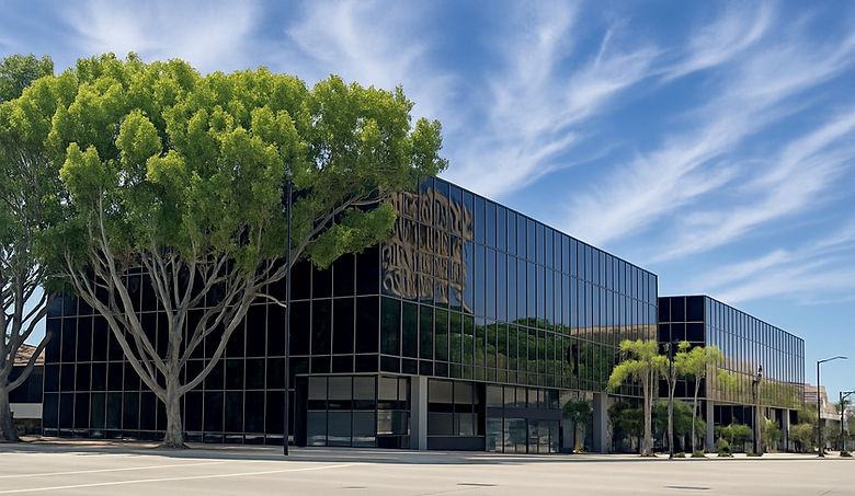 The former black-glass office building at 150 E. Colorado Boulevard, Pasadena, California was a modernist commercial structure completed in 1979. Located at a prime intersection in the city’s historic core, the three-story building featured reflective dark glass curtain walls that mirror the surrounding trees and neighboring architecture. Its minimalist design and clean horizontal lines exemplify late-20th-century corporate style, contrasting with nearby historic façades along Colorado Boulevard. Over the years, it has housed professional offices and retail tenants, benefiting from high visibility and walkable access to Old Pasadena’s restaurants, shops, and transit connections along the city’s main commercial corridor. The office building also featured a distinctive public art feature by artist Jean Wolff; L'Entreinte (The Embrace) which was an eight-foot high bronze sculpture on a blue granite base prominently situated along Colorado Boulevard.